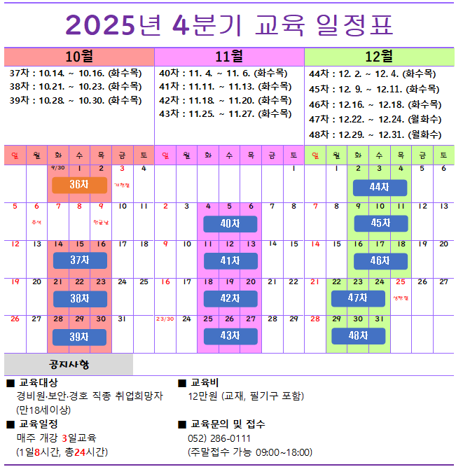 2025년 4분기 교육일정을 아래와 같이 공유 드립니다.