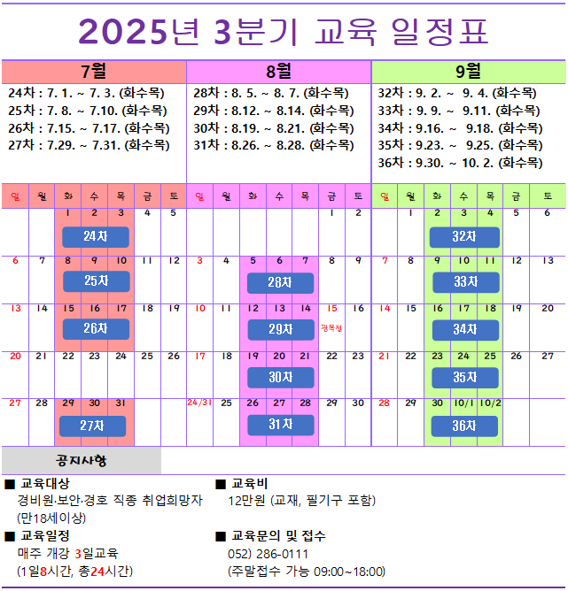 2025년 3분기 교육일정을 아래와 같이 공유 드립니다.